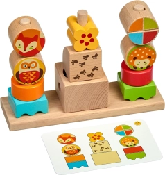 Interaktivní skládačka „Den a noc“ kombinuje zábavu a učení. Děti skládají barevné geometrické tvary a kostky se zvířátky na tři kolíky podle přiložených předloh. Denní karty ukazují barvy, noční karty zvýrazňují tvary – ideální pro postupné procvičování.