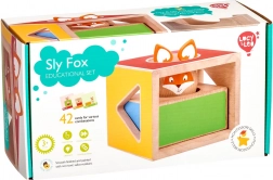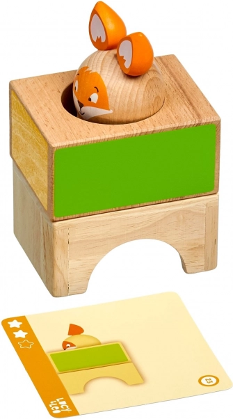 Tato dřevěná vzdělávací hra obsahuje tři masivní kostky s výřezy různých tvarů, dřevěnou figurku lišky a sadu oboustranných karet s úkoly různé obtížnosti. Děti podle předloh staví a kombinují kostky tak, aby se liška správně „schovala“, čímž trénují strategii a prostorové vnímání.