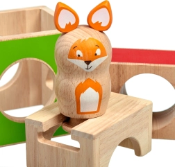 Hra plynule rozvíjí jemnou motoriku, koordinaci oko–ruka a slovní zásobu – zejména chápání předložek a příslovcí (např. v, na, před, za). Díky pevnému dřevu s hladkou úpravou a netoxickými barvami je hraní bezpečné a příjemné.