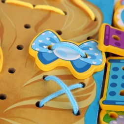 Šněrování a provlékání otvorů posiluje svaly prstů, koordinaci oko–ruka i soustředění. Ideální aktivita pro předškolní děti.