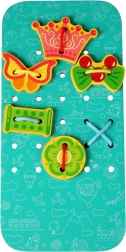 Dřevěný šněrovací set Princezna přináší hravou formu učení a spoustu nápadité zábavy. Na velké podložce s princeznou si děti mohou vytvářet vlastní účesy a zdobit je korunkami, mašlemi či motýlky, které pomocí tkaniček připevní do předem připravených otvorů. Aktivita podporuje trpělivost, soustředění a rozvoj jemné motoriky.
