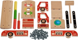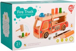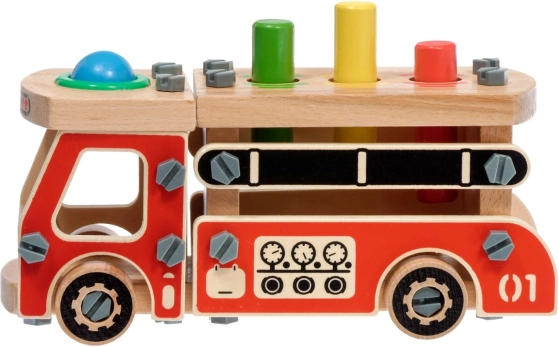 Tento kreativní set kombinuje stavebnici a zatloukačku v jednom. Děti si nejprve sestaví robustní hasičské auto ze dřeva a poté na jeho korbě využijí čtyři otvory k zábavnému zatloukání barevných prvků kladívkem. Díky jasným barvám a rozmanitým tvarům hračka podporuje přirozené učení a soustředění.
