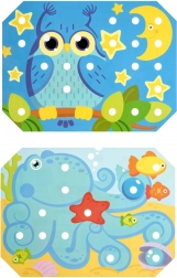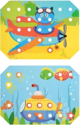 Děti si vyberou jednu z barevných předloh, položí ji na dřevěný podstavec a obrázek vyplňují kolíčky pomocí pinzety nebo rukou. Mohou také trénovat šněrování a vyšívání pomocí přiložených tkaniček. Hra přirozeně podporuje soustředění, logiku, trpělivost a přesnost.