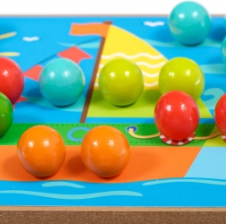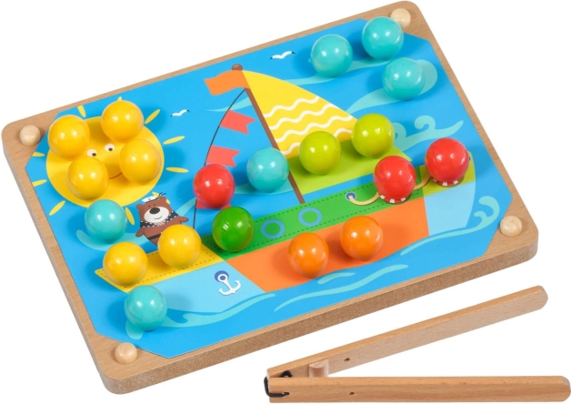 Dřevěný podstavec s otvory, barevné kolíčky a pinzeta motivují děti k přesnému úchopu a trénují jemnou motoriku i koordinaci oko–ruka.