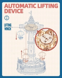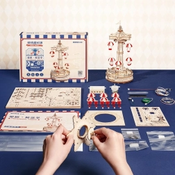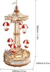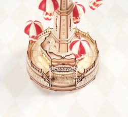 Tato propracovaná 3D dřevěná skládačka je inspirována klasickou padákovou věží ze zábavního parku. Šestiúhelníková základna a boční průsvitná okna propouštějí teplé světlo, které podtrhuje jedinečnou atmosféru. Kolotoč je poháněn bateriovým motorkem a osvětlen LED světly, přičemž dotykové ovládání umožňuje samostatně řídit pohyb i zvuk.