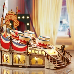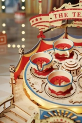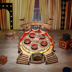 Elegantní kolotoč „Šálkový vír“ promění váš interiér v poutavé mini zábavní molo. Dřevěná 3D stavebnice s detailní cirkusovou výzdobou, šikmým otočným podvozkem a půlkruhovým schodištěm po sestavení skutečně ožije: pět šálků se pravidelně otáčí, podstavec se plynule točí a vše podtrhují efektní LED světla a jemná melodie Wind and Moon.