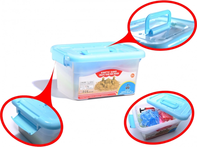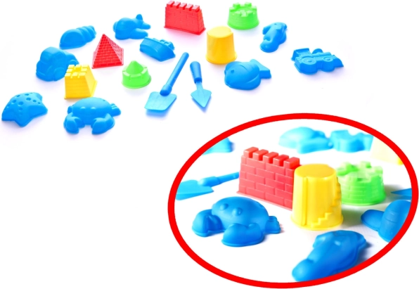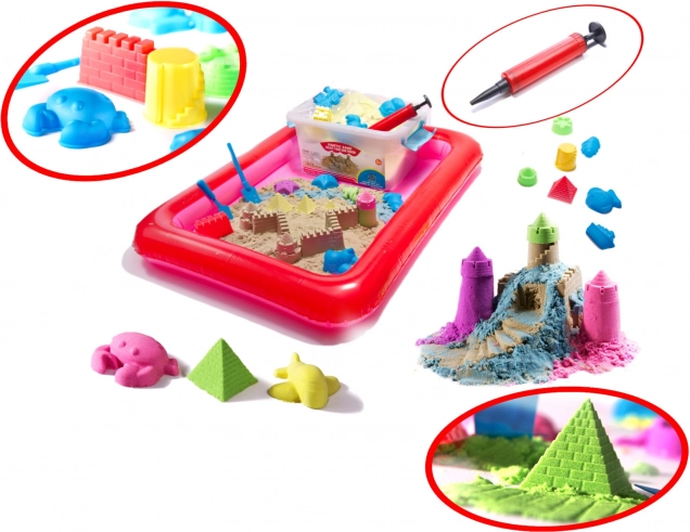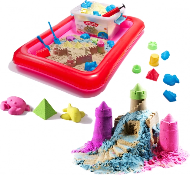 Dětská písková souprava obsahuje 14 plastových forem, hrábě, síta, špachtle a nálevku. S takovým příslušenstvím se nebudete nudit. V sadě s kinetickým pískem je také nafukovací pískoviště, které vám umožní udržovat pořádek v místě hry.