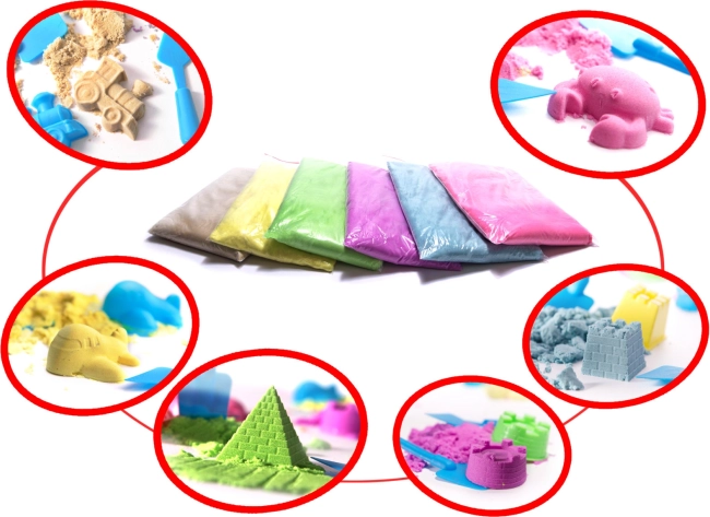 Plastová hmota se nerozsypává a její konzistence připomíná na dotek mimořádně příjemný a relaxační materiál. Písek po hraní neztrácí své plastické vlastnosti, takže si s ním dítě může hrát donekonečna.