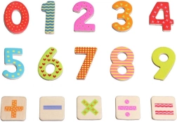 Sada zahrnuje pestré dřevěné číslice a základní matematické znaky. Děti snadno skládají jednoduché příklady a učí se počítat.