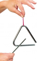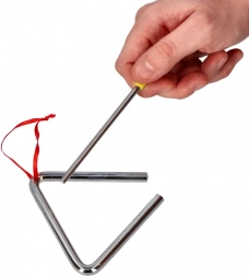Držte triangl za červenou šňůrku a lehce udeřte paličkou – i malé děti snadno vykouzlí krásný, dlouze doznívající zvuk, který podpoří cit pro rytmus.