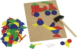 Objevte zábavnou vzdělávací hračku, která podporuje fantazii a trpělivost. Děti skládají barevné geometrické tvary na pevnou korkovou desku a pomocí malého dřevěného kladívka a hřebíčků je připevňují. Sada je skvělá pro první konstrukční projekty a tvořivé hry.