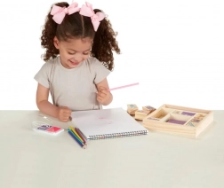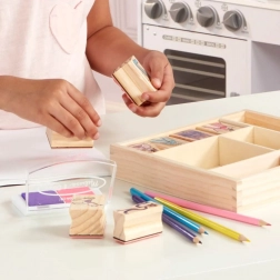 Stempleky a tužky jsou úhledně uloženy v elegantní dřevěné krabičce s přihrádkami, což zajišťuje snadnou organizaci a přenášení.