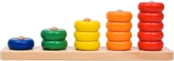 Tato kvalitní dřevěná třídicí hra je skvělá pro první krůčky ve světě čísel a barev. Děti vkládají celobarevné kroužky na jednotlivé kolíky podle číslic na podložce, čímž si hravou formou osvojují počítání, třídění a koordinaci ruka–oko.