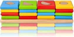 Čtyři věže s čtvercovými dílky a různými tvary otvorů učí děti rozlišovat barvy a tvary přirozenou, zábavnou formou.
