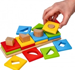 Masivní dřevo a odolné provedení zaručují dlouhou životnost a bezpečnou hru. Sada obsahuje základovou desku a 16 barevných čtverců, které lze skládat, třídit a kombinovat podle tvaru i barvy – ideální pro Montessori inspirované učení doma i ve školce.