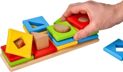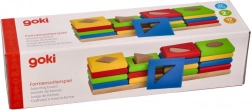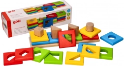 Tato kvalitní dřevěná skládačka od značky GOKI spojuje učení a hru. Čtyři sloupky s barevnými čtvercovými dílky a různými otvory (kruh, trojúhelník, čtverec aj.) učí děti rozeznávat tvary a barvy, zatímco rozvíjejí koordinaci oko–ruka a přesnost pohybu.