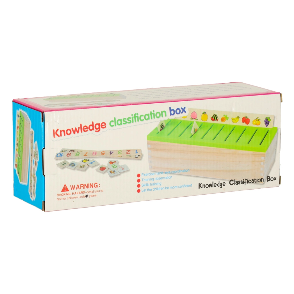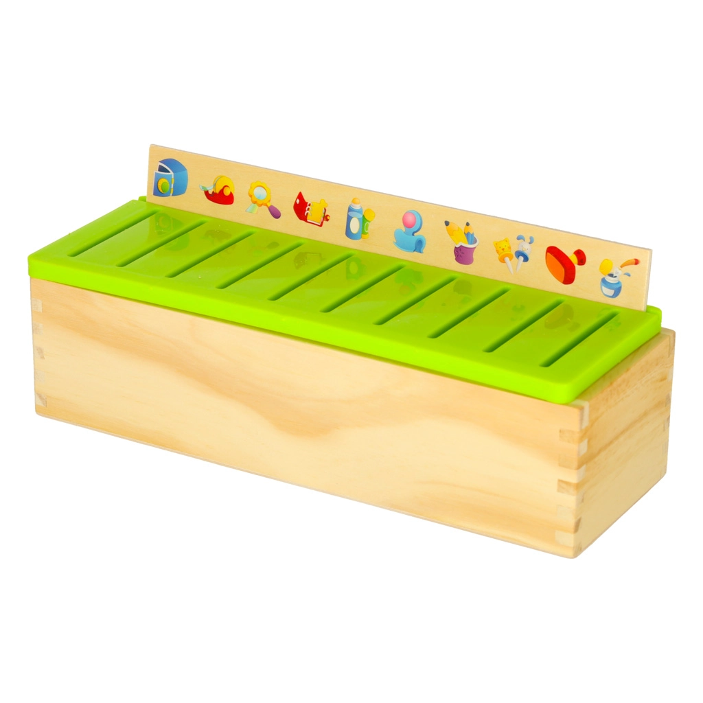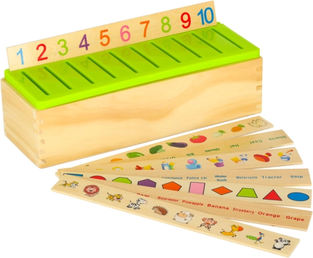 Vzdělávací sorter je promyšlená dřevěná skříňka s větraným zeleným víkem a sadou velkých tématických desek (čísla, tvary, zvířata, ovoce a zelenina, dopravní prostředky aj.). Děti přiřazují malé dřevěné kartičky s barevnými ilustracemi a anglickými pojmy k odpovídajícím obrázkům na desce a zasouvají je do správného slotu. Tím si cvičí pozorování, paměť, koncentraci a budují slovní zásobu.