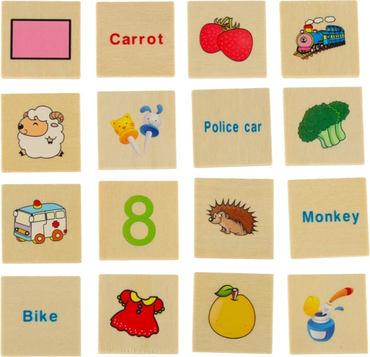 Velké tematické desky a 80 malých kartiček s ilustracemi a anglickými názvy učí děti poznávat kategorie, rozšiřují slovní zásobu a podporují vizuální paměť.