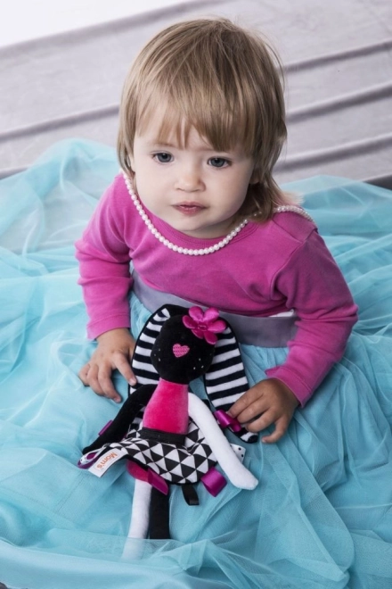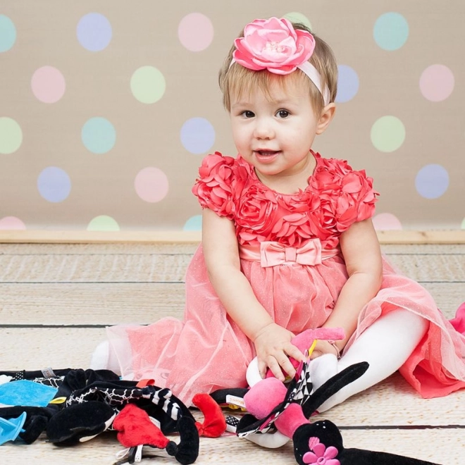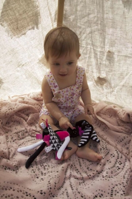 Měkké minky, bavlna a froté spolu se šustícími oušky a sukýnkou nabízí bohaté senzorické vjemy pro hmat i sluch.