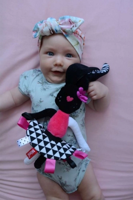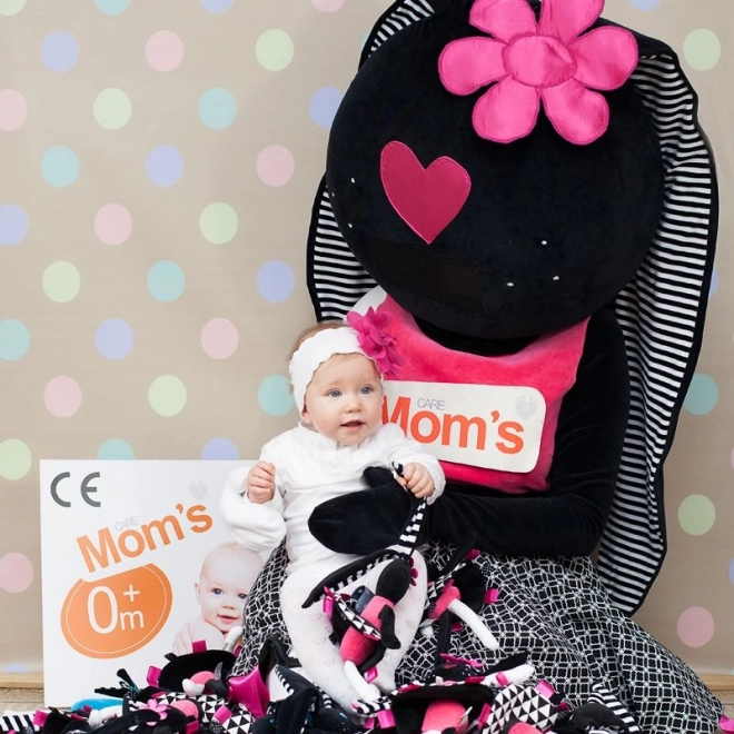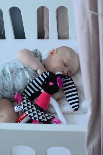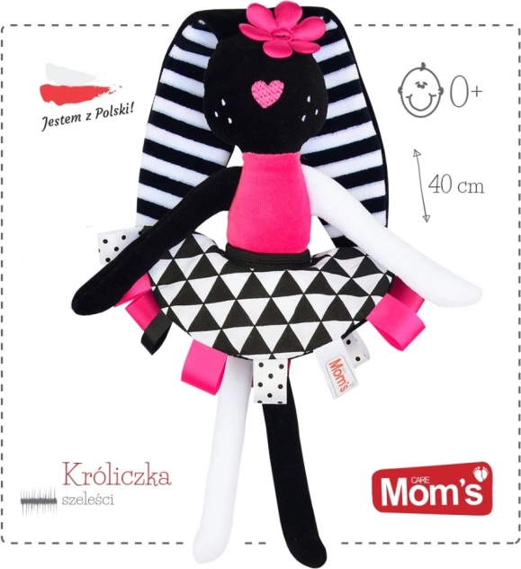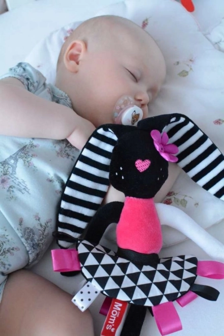 Tato hebká králička byla navržena tak, aby podporovala smyslový rozvoj miminka od prvních dnů. Výrazné kontrasty, jemné šustění v ouškách a sukýnce i pestré štítky přirozeně poutají pozornost, uklidňují a pomáhají rozvíjet koordinaci oko–ruka. Dlouhé uši a končetiny se snadno chytají, takže dítě trénuje úchop a jemnou motoriku.