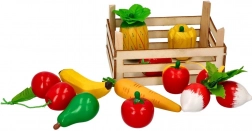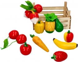 Dřevěná přepravka plná ovoce a zeleniny pro malé kuchtíky a prodavače, ideální pomůcka pro hraní na obchod nebo trh.