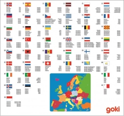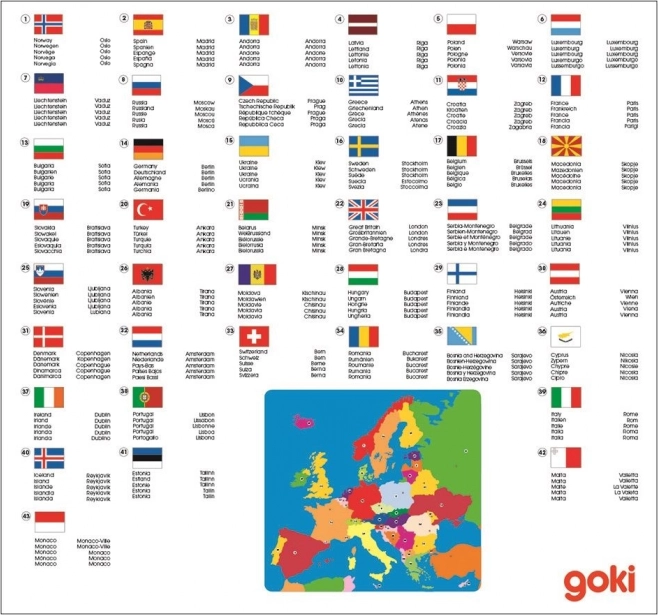 Dřevěné puzzle Mapa Evropy od značky Goki je ideální vzdělávací hračka pro děti i školáky. Díly ve tvaru jednotlivých zemí se skládají do robustní dřevěné desky s vyfrézovanými otvory, což usnadňuje manipulaci a podporuje správné umístění. Každá země je označena číslem a v legendě najdete její název, hlavní město a státní vlajku.