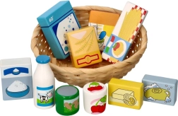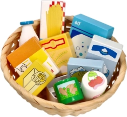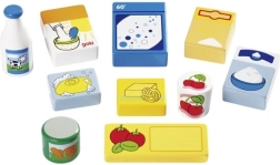 Barevné dřevěné kousky připomínají běžné potraviny (mléko, těstoviny, cereálie aj.) a motivují děti k přirozenému učení při hře.