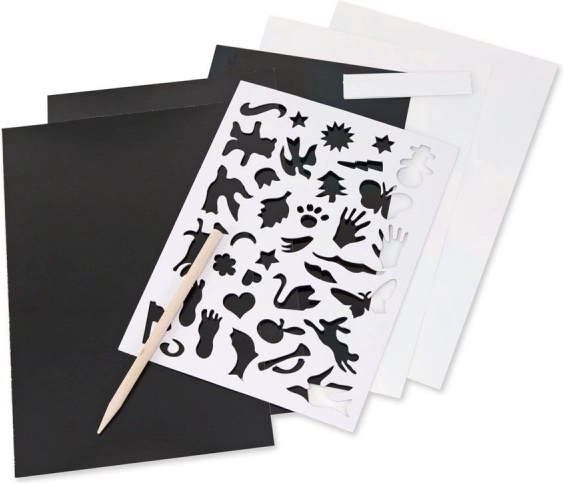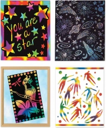 S touto sadou vytvoří děti i dospělí originální umělecká díla. Stačí jemně škrábat přiloženým dřívkem po černém povrchu a pod ním se odhalí duhové či holografické barvy. Hotové obrázky lze snadno zarámovat a vystavit.