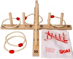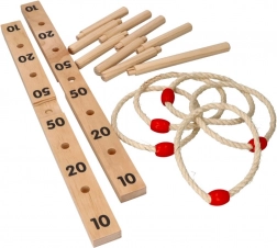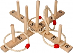 Tato hra obsahuje křížovou základnu s 9 dřevěnými sloupky a pět provázkových kroužků s dřevěným prvkem pro snadné házení. Hra je vyrobena z kvalitního dřeva, což zajišťuje dlouhotrvající zábavu.