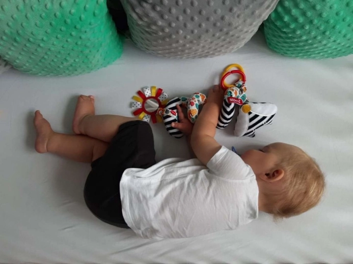 Spirála se snadno a bezpečně omotá kolem madla kočárku, autosedačky nebo postýlky, takže je vždy po ruce – doma i na cestách. Je vyrobena z bezpečných materiálů, splňuje normu EN-71 a vznikla v Polsku, což potvrzuje její kvalitu a pečlivé zpracování.