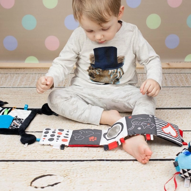 Tato měkká textilní knížka je navržena speciálně pro novorozence a kojence. Kontrastní vzory přitahují pozornost děťátka a podporují vývoj zraku, zatímco různorodé textury a šustivé prvky povzbuzují hmatové vnímání a zvídavé prstíky. Integrované bezpečné zrcátko pomáhá dítěti objevovat vlastní odraz a učí sebekontakt.