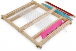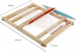Osnova je předem natažená a na čluncích najdete červenou a modrou přízi. Můžete začít tkát hned po rozbalení – ideální pro začátečníky a děti.