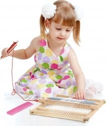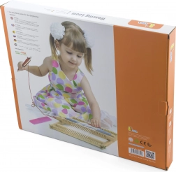 Součástí balení je vše potřebné pro okamžitý start: natažená bílá osnova a dvě barevná klubka (modrá a červená) na čluncích. Speciální zvedací lišta střídavě nadzvedává osnovní nitě, takže je protahování příze rychlé a přehledné. Estetické barevné balení potěší jako vzdělávací dárek pro malé tvůrce.