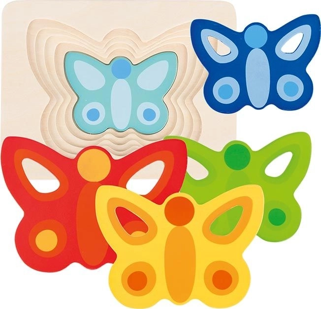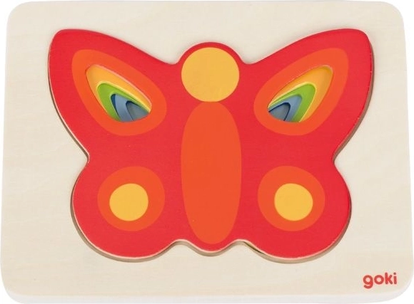 Objevte hravou vícevrstvou vkládačku s motivem barevných motýlů od značky GOKI. Děti si při skládání užijí spoustu zábavy a zároveň rozvíjejí jemnou motoriku, rozpoznávání barev a logické myšlení. Dílků je pět a do každé vrstvy pasuje vždy jen jeden motýlek, což podporuje trpělivost a souvislé učení.