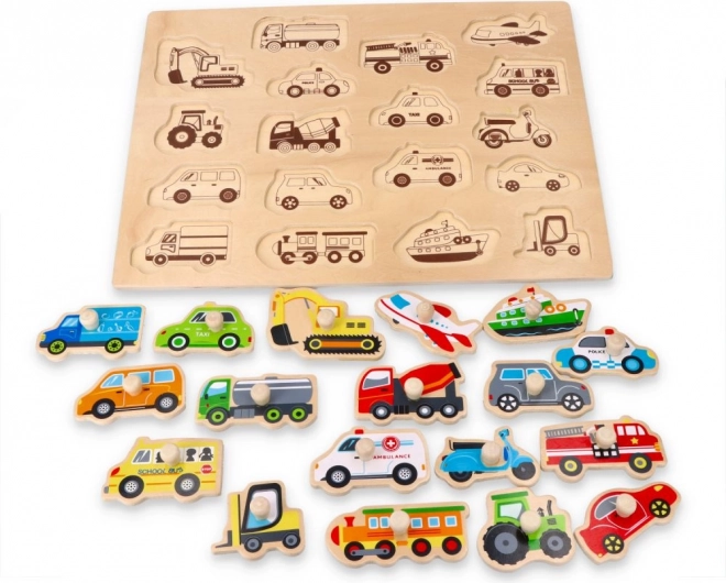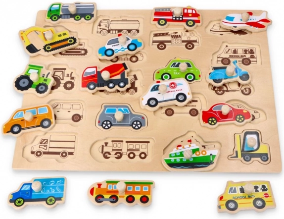 Tato kvalitní vkládačka z přírodního dřeva nabídne dětem bezpečnou a poutavou hru. Každý dílek představuje různé vozidlo a má praktické dřevěné knoflíkové úchyty pro snadné uchopení malými ručičkami. Na podložce jsou natištěné obrysy, které dětem pomáhají správně dílky umístit a učí je rozpoznávat tvary a barvy.