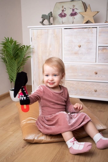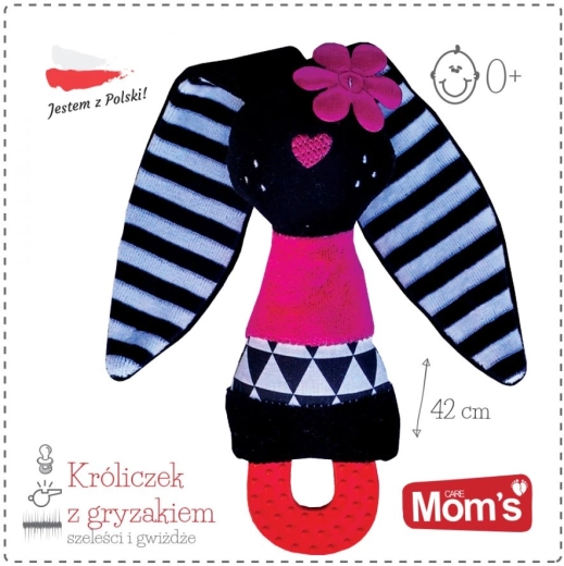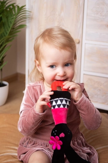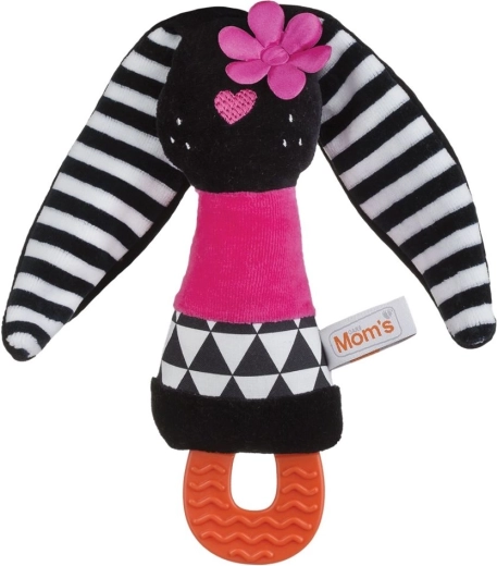 Tento měkoučký králíček z velurové látky byl navržen tak, aby podporoval rozvoj smyslů již od prvních dnů života. Šustící ouška lákají ke zkoumání dotykem a posilují úchop, pískátko v bříšku zaujme sluch a kousátko uleví citlivým dásním při prořezávání zoubků. Díky kontrastním černo‑bílým prvkům hračka snadno zaujme i nejmenší miminka.