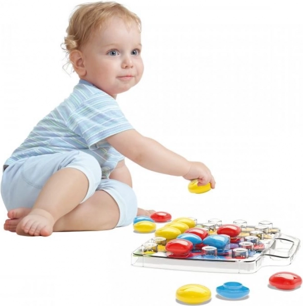 Set obsahuje praktický kufřík, který lze rozložit na základnu s deskou, do které děti vkládají kolíky různých velikostí. Pomocí těchto prvků mohou děti vytvářet zábavné a pestrobarevné kompozice.