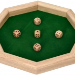 Hrací deska je vyrobena ze dřeva a její plocha je potažena semišem pro tišší dopad a lepší kontrolu hodů. Součástí jsou dřevěné kostky, které příjemně padnou do ruky. Kompaktní rozměry umožňují snadné přenášení a skladování.