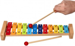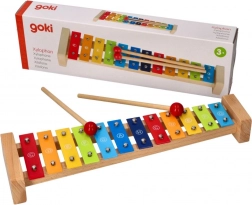 Barevný xylofon Goki se zpěvníkem Duha je skvělou volbou pro první seznámení s hudbou. Robustní dřevěná konstrukce v kombinaci s kovovými klávesami zajišťuje příjemný zvuk a dlouhou životnost. Díky názvům not na klávesách a barevnému vedení ve zpěvníku děti snadno pochopí souvislosti mezi barvami, tóny a jednoduchými melodiemi.