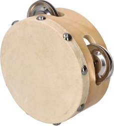 Tamburína má tradiční vzhled s přírodním dřevěným tělem a pevně uchycenými kovovými činelkami.