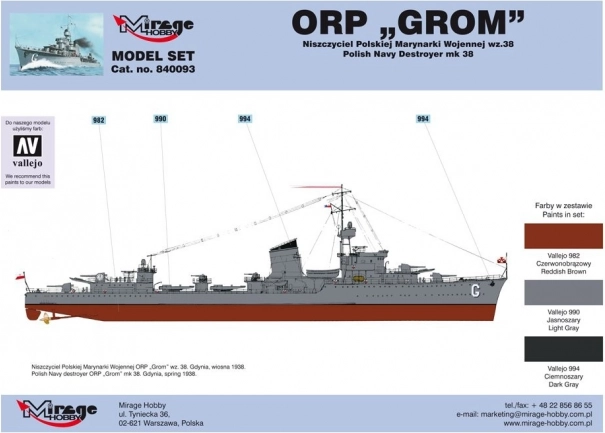 Detailní model torpédoborce ORP 'Grom' z druhé světové války pro nadšence modelářství. Umožňuje vytvořit přesnou repliku známého polského torpédoborce s kvalitními komponenty.