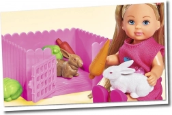 - Panenka Steffi, panenka Evi, 4 zvířátka, stůl, bouda pro psa, klec pro králíka, hřiště a další doplňky
