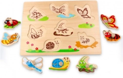 Tato dřevěná vkládačka s úchyty s motivem hmyzu je ideální didaktická hračka pro první objevování tvarů. Díky pohodlným knoflíkovým úchytům se děti snadno naučí manipulovat s dílky, rozvíjejí jemnou motoriku a koordinaci oko–ruka.