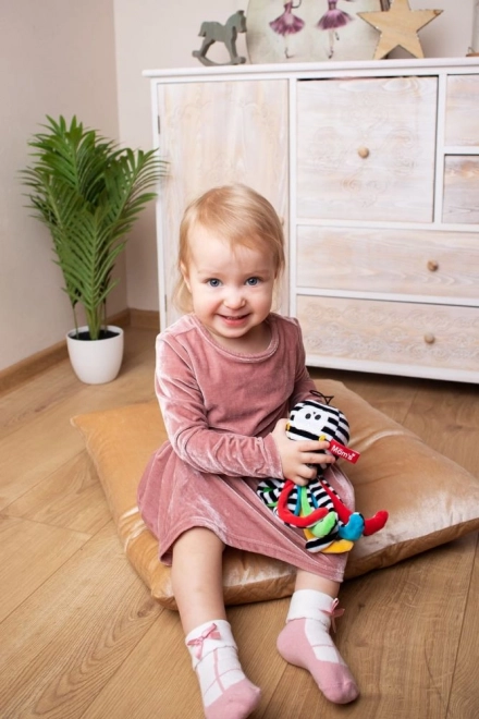 První smyslová hračka pro miminko – černo-bílá chobotnice je vytvořena s ohledem na potřeby nejmenších. Vysoký kontrast vzorů podporuje rozvoj zraku v raných týdnech, měkké chapadla přinášejí pocit jistoty a různé povrchy lákají k objevování dotykem. Jemný zvoneček dodává uklidňující zvukový podnět.