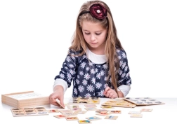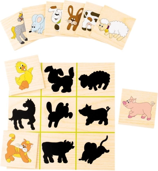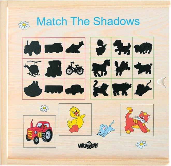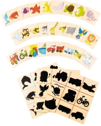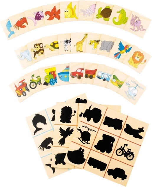 Barevné dřevěné destičky s ilustracemi zvířat a vozidel děti párují s odpovídajícími stíny. Zábavná forma, která podporuje rozlišování tvarů a trénuje pozornost.