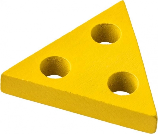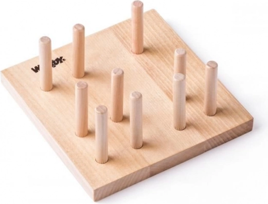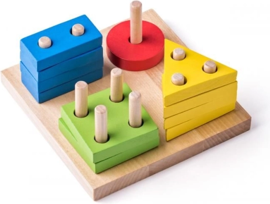 Barevná dřevěná vkládačka rozvíjí dětskou jemnou motoriku, koordinaci oko–ruka a schopnost rozlišovat barvy a tvary. Na pevné dřevěné základně jsou kolíky, na které děti navlékají kruhy, obdélníky, trojúhelníky a čtverce podle počtu otvorů.