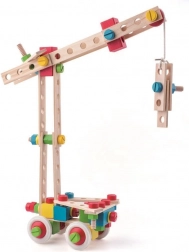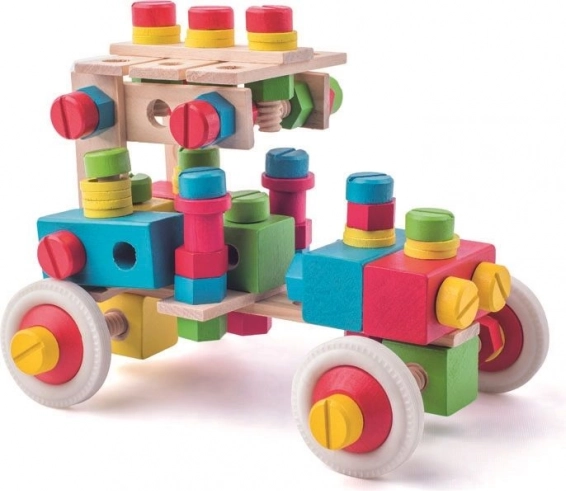 Tato pestrá stavebnice s 140 dílky umožní dětem stavět vozítka, tvary i jednoduché konstrukce. Barevné šrouby, spojky a kola motivují k objevování, zatímco dřevěné prvky přidávají hračce příjemný přírodní charakter. Vše je uloženo v odolném kbelíku, který udržuje pořádek v dětském pokoji.