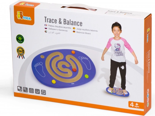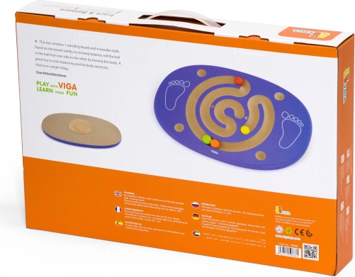 Balanční deska s labyrintem od VIGA promění trénink rovnováhy v zábavnou hru. Dítě stojí na protiskluzové ploše s vyznačením chodidel a nakláněním desky vede barevné kuličky vyfrézovanými dráhami. Tato interaktivní pomůcka rozvíjí stabilitu, koordinaci oko–ruka a posiluje hluboký stabilizační systém.