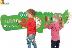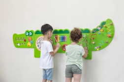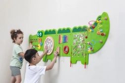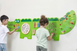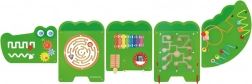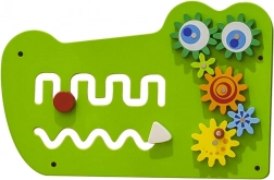 Nástěnná tabule Krokodýl rozdělena do pěti částí nabídne dětem různé aktivity: hlavová část s labyrinty a převody ozubených kol, kruhový bludiště s kuličkou, hudební panel s barevným xylofonem a rumbovací plochou, magnetický labyrint se dvěma magnetickými tužkami a ocas s trojicí 3D korálkových drah. Každá sekce podporuje jinou dovednost a motivuje děti k objevování.