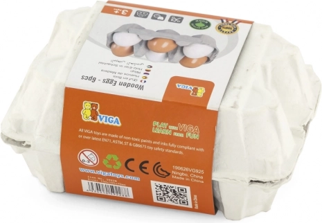 Sada obsahuje 6 dřevěných vajec v praktické kartonové vaničce, která věrně napodobuje skutečné balení. Děti mohou napodobovat dospělé při vaření, „nakupovat“ v dětském obchodě nebo servírovat jídla v kuchyňce. Odolný materiál a hladký lakovaný povrch jsou příjemné na dotek a snadno se udržují.